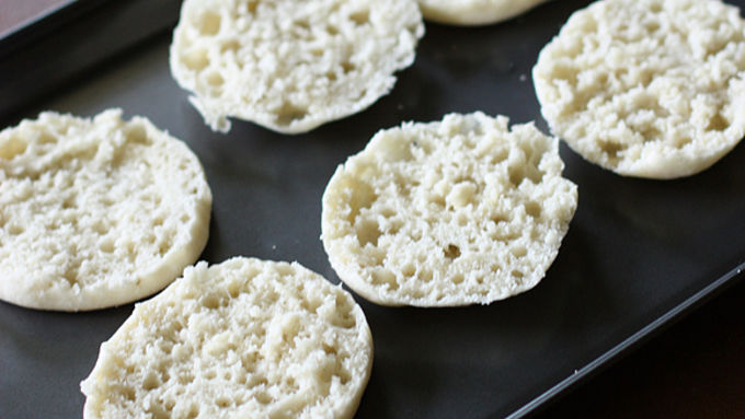 Step3Place English muffin halves on a cookie sheet and brush with some butter if desired. Bake in the oven for about 6-8 minutes or until lightly toasted. I placed mine in the oven on the upper rack when my eggs were about halfway done so everything was done around the same time.