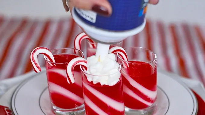 - Get your peppermint fix with these sweet holiday jelly shots. Forget about leaving Santa cookies and milk this Christmas. He will LOVE these candy cane jelly shots! Rudolph may have to drive the rest of the way, but you will definitely have the best presents under the tree. For garnishes, use whole mini candy canes and little pieces made by crushing a few canes inside a plastic bag. When ready to serve, insert a mini candy cane into the side of each glass and top with whipped cream and crushed candy canes. Ho Ho Happy Holidays!!