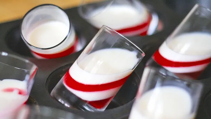 Step3Place shot glasses at an angle in a muffin pan. Begin by spooning a couple teaspoons of red gelatin into each glass. Place in refrigerator and allow to partially set, about 20 minutes (it should no longer be liquid, and you should be able to lightly touch the surface with your finger). Next, add a little of the white gelatin to each glass. Replace in fridge until partially set, about 20 minutes. Repeat this process until you have the desired amount of layers. For the last layer you can sit the glass upright. Allow to set completely in fridge another 2-3 hours at least (or overnight).