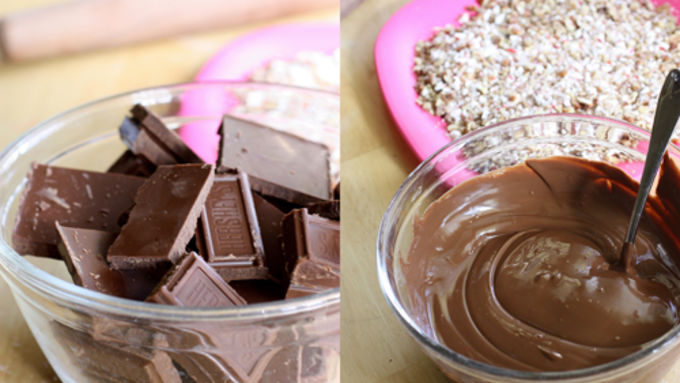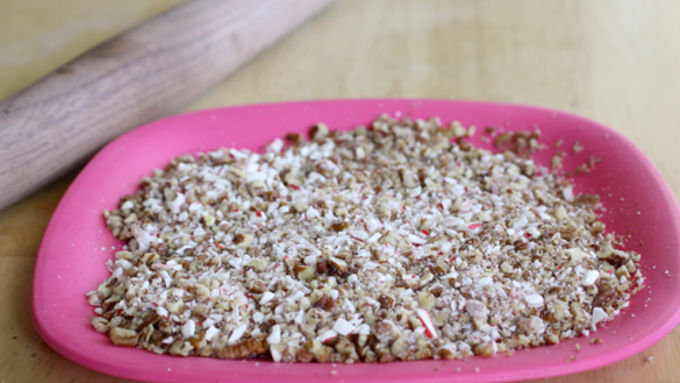 Step2While chocolate is cooling, chop pecans and crush the candy canes. An easy way to crush the candy canes is by placing them in a resealable plastic bag and using a rolling pin to crush them. Place chopped pecans and crushed candy canes on a plate and toss so they are incorporated. Set aside.