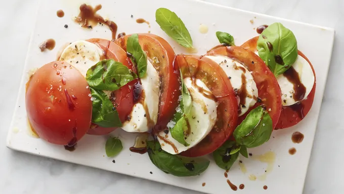 Step4Drizzle slices with olive oil and balsamic vinegar reduction. Sprinkle with salt and pepper to taste.