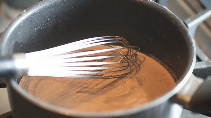 Step1Add water and hot chocolate mix to a medium-sized sauce pan. Whisk to dissolve hot chocolate. Stir in sweetened condensed milk and caramel sauce.