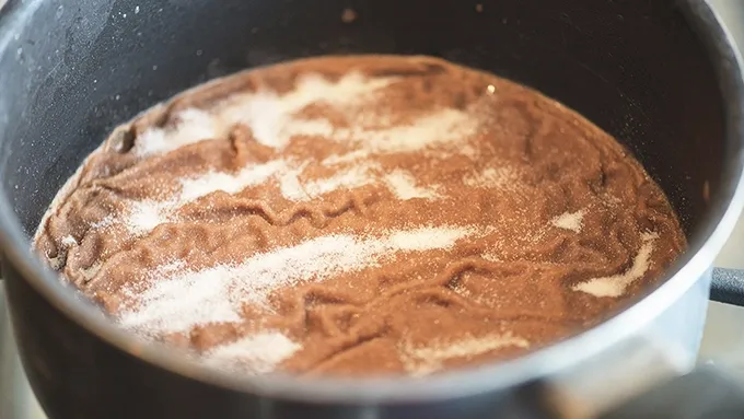 Step2Sprinkle gelatin over mixture and let sit for 2 minutes. Whisk mixture together and bring to a simmer over medium heat.