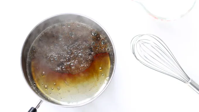 Step2Stir together the sugar and water in a saucepan. Heat without stirring over medium high, occasionally swirling the mixture by tilting the pan, until the sugar turns a deep caramel amber color, about 6 minutes. Watch the mixture closely to avoid burning.