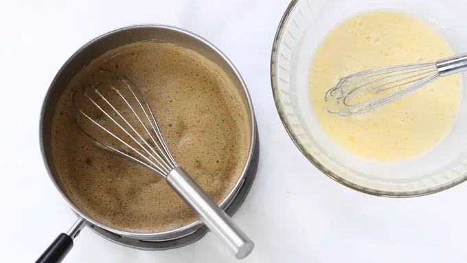 Step3Remove the pan from the heat and slowly whisk in the remaining milk. The sugar will harden and get sticky. Place the pan back on low heat and simmer for ten minutes, whisking occasionally, until the sugar has dissolved again and no more stickiness remains. The mixture will be foamy.