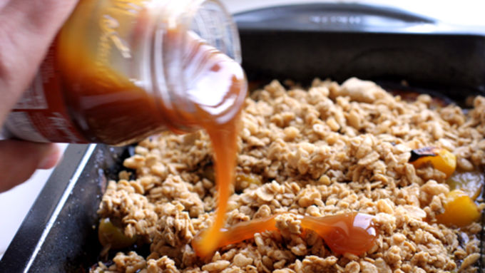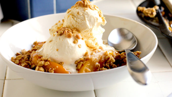 - Summer's over, but you can still have your peaches in this crazy quick 'n crunchy cobbler! A fresh baking dish of steaming spiced peaches emerges from the oven, finds it's way topped with granola and slathered in caramel sauce to create a beautiful, rich Caramel Peach Cobbler dessert that's so easy, it'll have you dancing in the kitchen with a spoon and your groovy pants. Did someone say butter? Yeah, you're going to need melted butter. This has everything to do with flavor and nothing to do with your waistline. Just keep telling yourself that. Toss a bunch of Cascadian Farm granola cereal on top. That granola is as organic as your peaches. This has everything to do with your health, and nothing to do with your bathroom scale. Just keep telling yourself that. All you need now is a scoop of ice cream. Make it organic if you please, just make it BIG. Like I said, this has NOTHING to do with your waistline, bathroom scale, or diet plan. Grab a spoon and enjoy! More Easy Peach Treats If peaches are your thing, try these easy dessert recipes that start with delish frozen peaches.