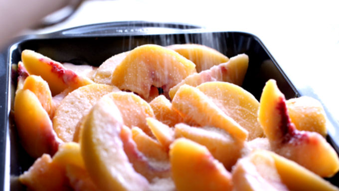 Step1Place peaches in an 8x8 baking dish. Drizzle melted butter atop. Sprinkle sugar, cinnamon, and nutmeg on top.
