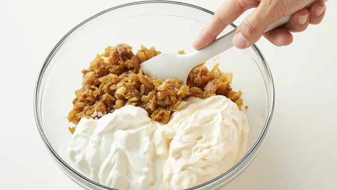 Prepare dip by mixing mayonnaise and sour cream with cooled onions; stir until completely combined. Refrigerate until ready to serve.