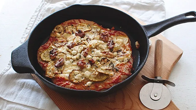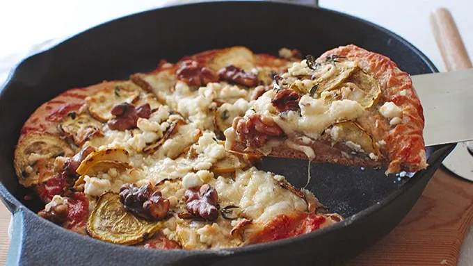 - Pizza in a cast iron skillet. You'll feel so rustic! Not only will you feel super rustic, but this pizza is topped with goat cheese. And we all know what that means. We all know, right? Wait, what does it mean? Never mind. Goat cheese! AND it's topped with walnuts. Walnuts are brain food, ya know! They're shaped like a brain, too. I put halved walnuts on my pizza, so like half brains. Makes sense, doesn't it? Don't answer that. It's also topped with summer squash! The yellow kind. Little sautéed circles of summer glory. Gosh. It all cooks so evenly in that cast iron skillet. Then you slice. Then you eat all of it before anyone notices. Because that's rustic, too. Maybe. Pizza!