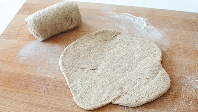Step3Roll out the pizza dough balls on a floured work surface until you get a rough 8-inch circle. Brush each ball with the remaining oil and place on the hot cast iron skillet (one at a time) and par-bake for five minutes.
