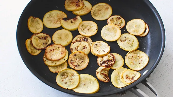 Step2Heat 1 tablespoon of the oil in a medium sauté pan. Add the sliced squash in batches and sauté until browned on both sides. Season with a small pinch of salt and pepper.