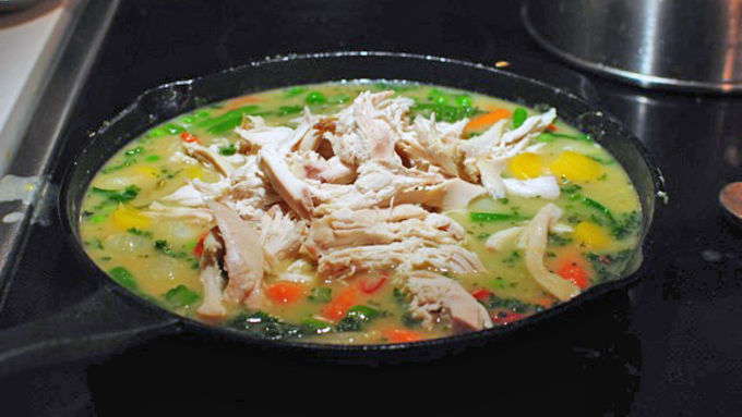 Step7Add the chicken and simmer for about 5 minutes, until it's nice and thick. Season well with salt and pepper.