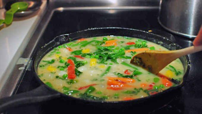 Step6Add the broth, 1/2 cup at a time, until slightly thickened. Stir in the veggies and peas.