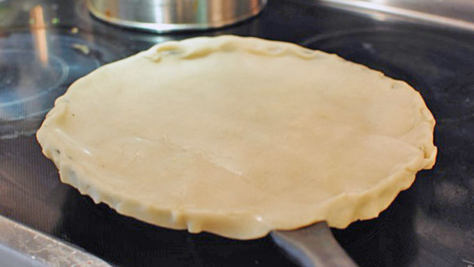 Step8Unroll the pie crust and lay it over the cast iron. You may pinch the edges if you choose, or leave them be.