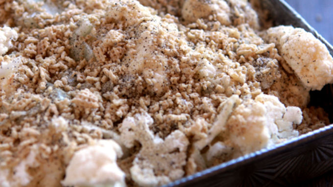 Step4In a small bowl, combine Rice Chex™, melted butter, pepper, nutmeg, and a bit of salt. Sprinkle over the cauliflower.