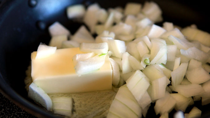 Step2In a saucepan, cook the onions in the 4 tablespoons of butter over medium heat, just until the onions are translucent. Then sprinkle in the flour and whisk it to make a thick roux.