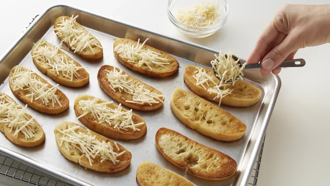 Meanwhile, set oven control to Broil. Arrange ciabatta slices on ungreased large cookie sheet; brush both sides with melted butter. Broil with tops 6 inches from heat 1 to 2 minutes on each side or until lightly toasted. Sprinkle rounded tablespoonful of Parmesan cheese on top of each slice. Broil 1 to 2 minutes or until cheese is lightly browned. Serve with soup.