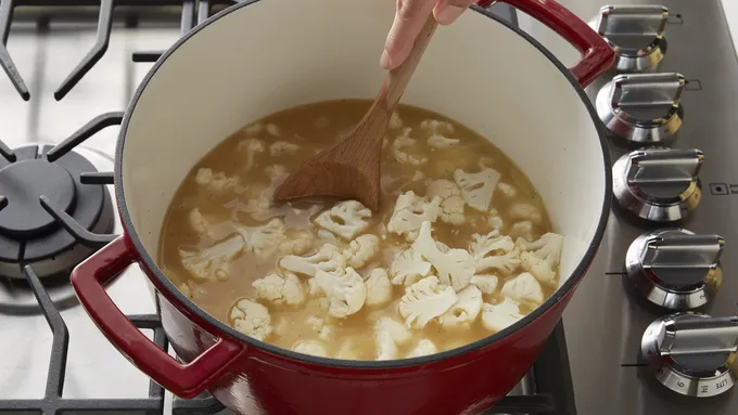 Stir in broth and cauliflower; heat to boiling. Reduce heat to low; simmer 15 minutes.