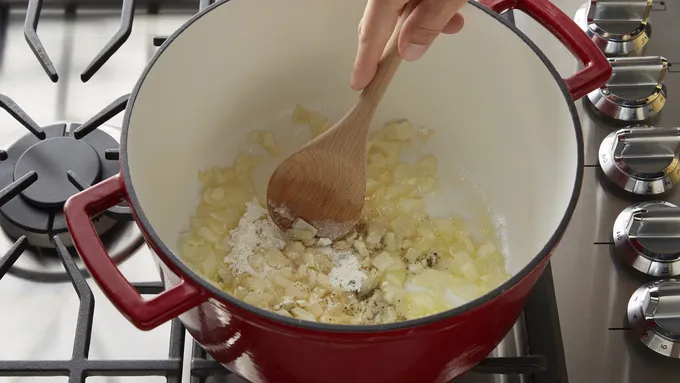 In 5-quart Dutch oven, heat 3 tablespoons butter over medium heat. Cook onions in butter 4 minutes, stirring occasionally. Add garlic; cook and stir 1 minute. Add flour, salt and pepper; cook and stir 2 minutes.