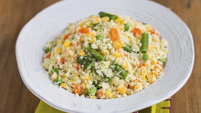 No, it's not rice mixed with cauliflower. It's pure, unadulterated cauliflower. And it looks like rice.