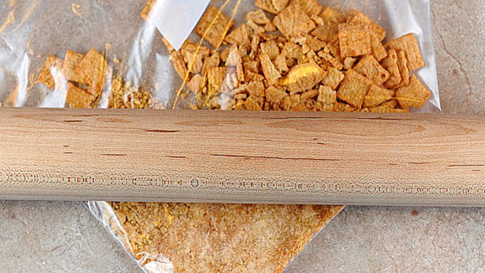 Step1Place each flavor of cereal into a SEPARATE plastic bag and seal. Using a rolling pin, roll across the bag, crushing the cereal. When all of the cereal is crushed, pour onto a clean plate. Do this with all four cereals (or however many you are making).