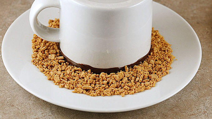Step4Then immediately dip your chocolate-covered rim into the cereal plate. In the same way you spun the cup around the chocolate, do the same for the cereal. You many need to help with your hands and push some cereal up onto the sides.