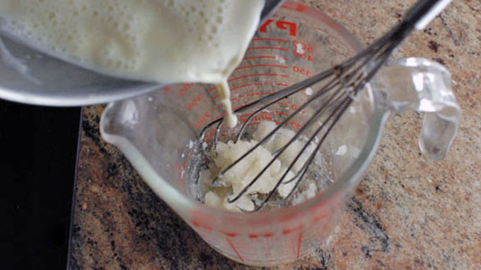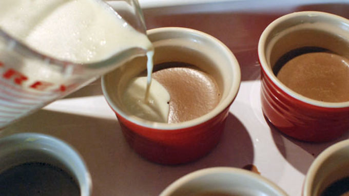 Step6Slowly pour this milk/gelatin mix over the top of the Cocoa Puff™ portion, filing the ramekins the rest of the way.