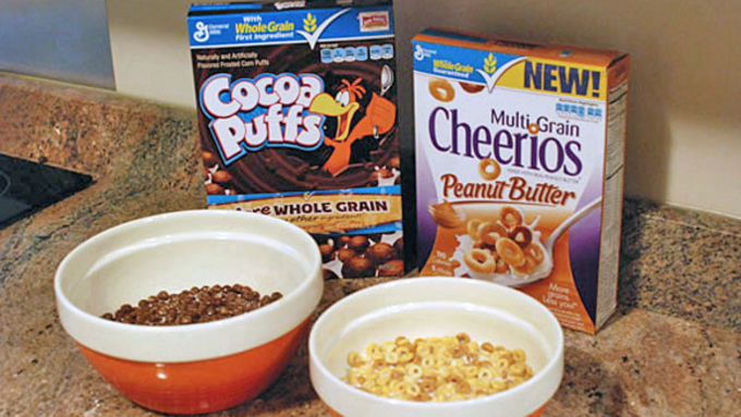 Step1Pour 1 cup of cream and 1 cup of milk over the Cocoa Puffs™, then so the same with the remaining milk and cream with the Cheerios™. Allow to sit for an hour.