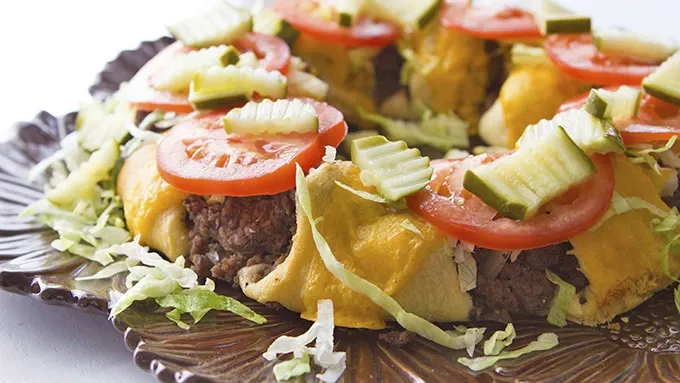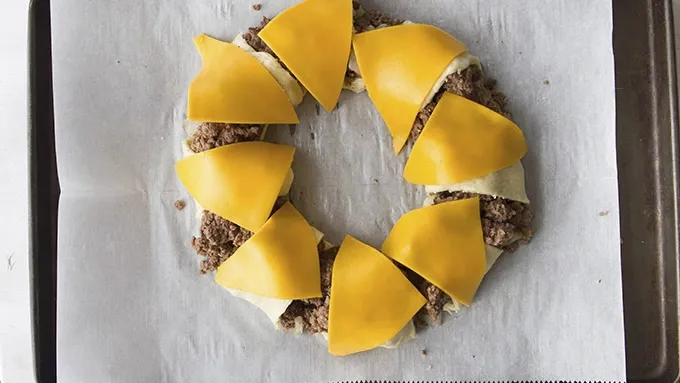 Step3Spoon cooked burger and onion mixture toward the center of the ring, on the larger ends (not toward the points), then pick up each triangle point and place it up and over the filling mixture. Place sliced cheese around the top of the ring. Bake for 20-25 minutes or until crescents have turned a light golden brown.