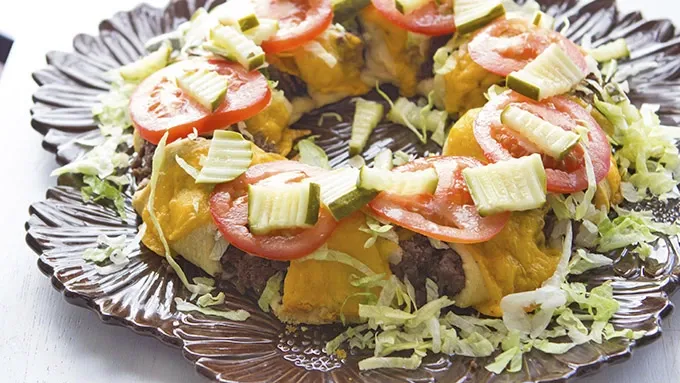 - A cheesy burger and all the toppings, baked easily in a flaky ring of baked crescent dough. Craving a big, juicy cheeseburger? How about a cheeseburger so big, you have to share?! This Cheeseburger Party Ring delivers all the flavor of a classic malt shop burger, but serves it up in a clever new way. You can make this 8-person, game day-perfect cheeseburger in 30 minutes or less. Top it with every last one of your fave burger toppings, and serve it with our secret dipping sauce. (People from Utah will recognize this as the indomitable "fry sauce". It’s a local obsession!) Slice, dip and enjoy.