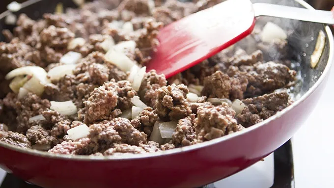 Step1In a large skillet, brown burger and onions together until fully cooked. Use a spatula to break the ground beef into large chunks, but do not over-crumble. Salt and pepper lightly.