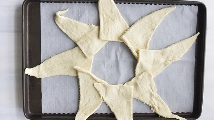 Step2Open Pillsbury™ Crescents, unroll and separate each triangle. On a parchment-lined baking sheet or pizza pan, arrange the triangles so the thicker ends are overlapping each other and the thin points are extending away from the center of the circle.