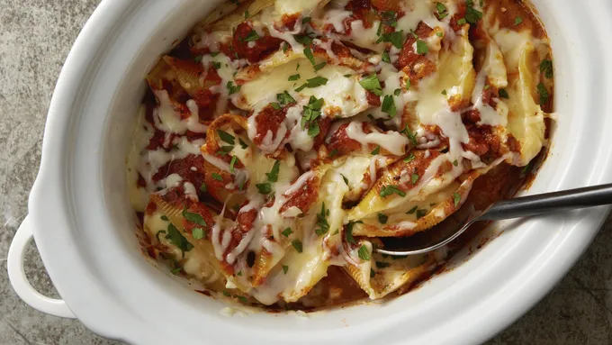 That feeling when two of your favorite foods combine into one amazing dish? Pure bliss. All the flavors of a cheeseburger – beef, cheese, onions – are stuffed into tender pasta shells and baked to absolute perfection. End with a drizzle of ketchup and your taste buds won’t even miss the bun.