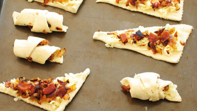 Step3In the meantime, preheat oven to 375°F. Unroll the crescent rolls onto a baking sheet. Layer with shredded cheese, chopped onions and bacon crumbles. Roll up into the crescent shapes. Bake for 10 to 12 minutes, or until golden brown on top.![]()