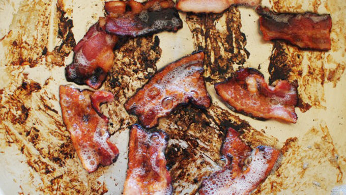 Step2In the meantime, in another skillet, render your bacon until crispy. Set aside to drain; crumble.![]()