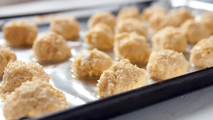 Step3Lightly oil a baking sheet and measure out heaping spoonful-sized balls onto the sheet. Don’t worry too much about shaping them, but do leave some space between each ball. You should get 20-25 tots.