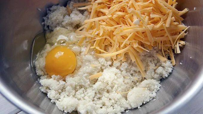 Step2In a medium bowl, stir together shredded cauliflower with grated cheese, egg, flour, hot sauce and a pinch of salt. If the mixture is very wet and doesn’t hold its shape, add more flour by the tablespoon until desired consistency is reached.