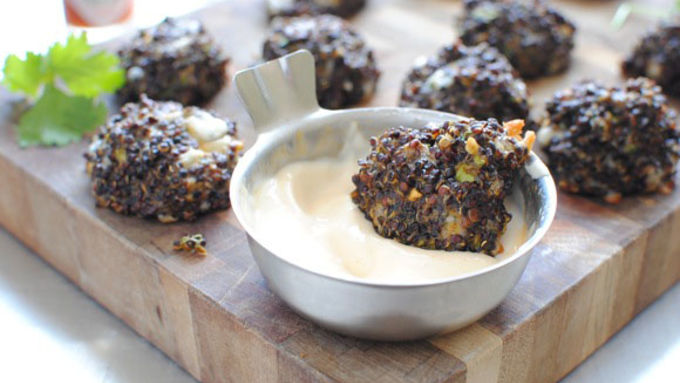 - Cheesy Black Quinoa Bites. Did you even think this was possible? IT IS. Did you even expect these flavors to go together so swimmingly? THEY DO. Do I think you should eat these within the next 3.5 minutes? I DO. Do I think your kids might like them? I BET THEY WILL. Did you think they'd fall apart in the oven with nothing to give them support? THEY DON'T. Did you think that melty cheese and quinoa could ever have such a glorious marriage? THEY DO. And, oh! The dipping sauce. Mayo + your favorite hot sauce. Done. You can adjust the heat based on what your buds will tolerate. Mine will pretty much tolerate an inferno. And that's it! They are perfect little nutty Tex-Mex oozy cheesy healthy bites that you can pop and not stop and it's okay. Oh it is so, so okay.