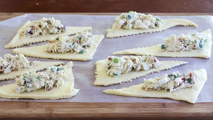 Step2Lay out the crescent rolls on a non-stick surface according to the package directions. Put about 2 heaping tablespoons of the mixture on each triangle and then roll them up, starting with the wide end.