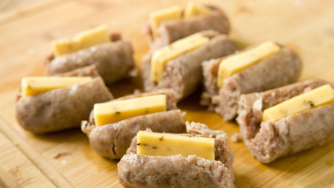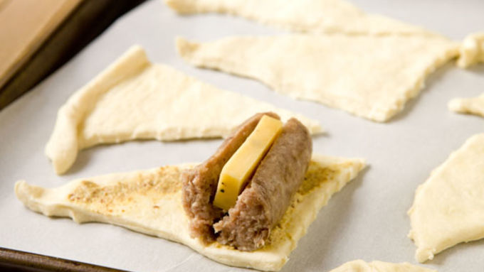 Step4Add a cheese-stuffed brat to the wide end of the crescent roll and roll up. Repeat with remaining brats and crescent rolls.