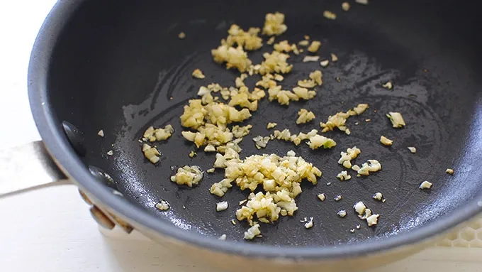Step1Preheat oven to 350°F. Heat the oil in a small sauté pan and add the garlic. Sauté for 30 seconds, until fragrant.