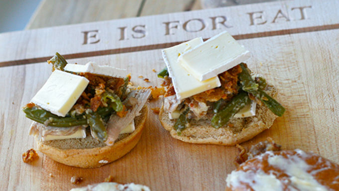 Step2Assemble sandwiches in following order: bread, brie, turkey, green bean casserole, fried onions, more cheese, bread.