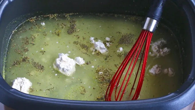 Step1Add the broth, flour, and spices to the slow cooker and whisk until the flour is dissolved and incorporated.