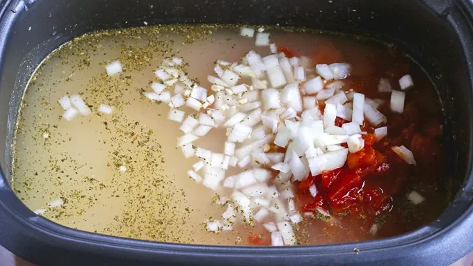 Step2Add the onion, garlic and tomatoes and cook on Low for 4-5 hours or High for 2-3 hours.