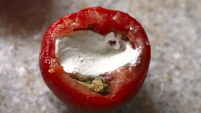 Step6Place a second heaping tablespoon of stuffing mixture into each tomato. Press down lightly.