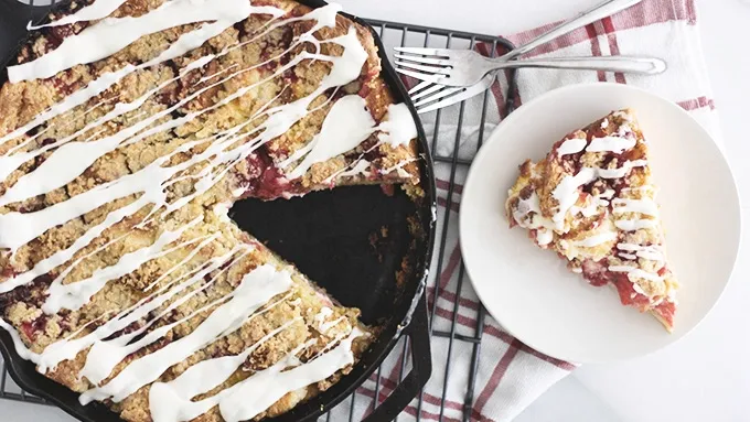 - Make this perfectly non-traditional, non-chocolate dessert in your cast iron skillet for an extra special Valentine's Day treat! If there’s anything I’ve learned in nearly five years of marriage with my guy, it’s that the way to his heart is most definitely through his stomach. Good thing, because it’s the way to mine, too – which is to say, we eat quite well! Every year for Valentine’s Day, we make each other a fantabulous home-cooked meal. He makes the dinner, I make the dessert. This year, I’m contemplating making approximately 12 hundred dozen desserts because I can’t seem to narrow down all the yummy options – but most likely, I’ll go with this Cherry Cheesecake Bread Pudding, inspired by the The Old Hen blog. I mean, nothing can really compete with gooey bread pudding topped with dollops of cream cheese, cherry pie filling, sugary streusel and cream cheese icing. Are you drooling yet? I know I am … totally a good look for Valentine’s Day! My serving suggestion: One half of the pan for you, one half for your sweetie.