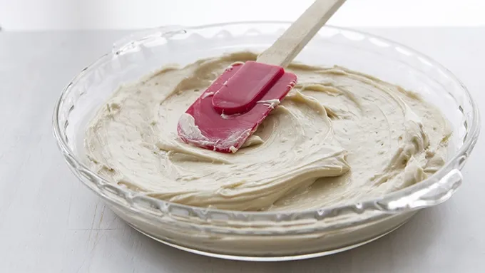 Step6In a stand mixer or large bowl, beat together cream cheese, powdered sugar, and vanilla. Spoon into a 9-inch pie pan.