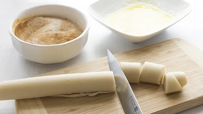 Step4Dip each strip in melted butter, then into cinnamon sugar mixture.