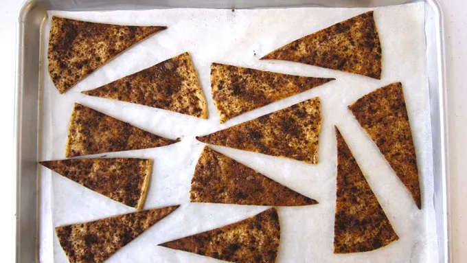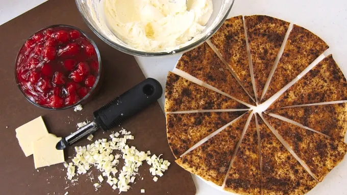 Step1To make the crust: Preheat oven to 425° F. Dust cutting board lightly with flour. Unroll thawed dough on cutting board. Whisk together the egg and water. Brush a thin layer of egg wash over the dough. Sprinkle cinnamon sugar over top. Cut dough into 12 equal wedges. Place on parchment lined baking sheet. Bake for 8-10 minutes until golden brown and crisp. Remove and allow to cool completely.