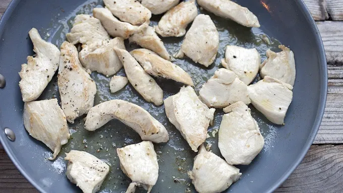 Step2In a large skillet, add 2 tablespoons olive oil over medium heat. Add chicken. Season chicken with a pinch of salt and pepper and cook for 6 minutes until chicken is cooked through (it’s okay if it’s slightly undercooked. It will cook more later).